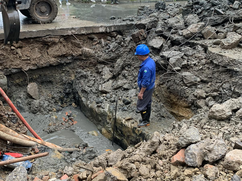 下午2時,公司準時關閉總閘,2臺挖掘機同步開展深度挖掘作業(yè)。受管道埋深大、地下土質(zhì)復雜、作業(yè)面狹窄等因素影響,施工難度遠超預期。經(jīng)過8小時連續(xù)作業(yè),施工人員才找到DN800mm預應力水泥管,并確認爆管主要因為管道大小接頭處膠圈斷裂。