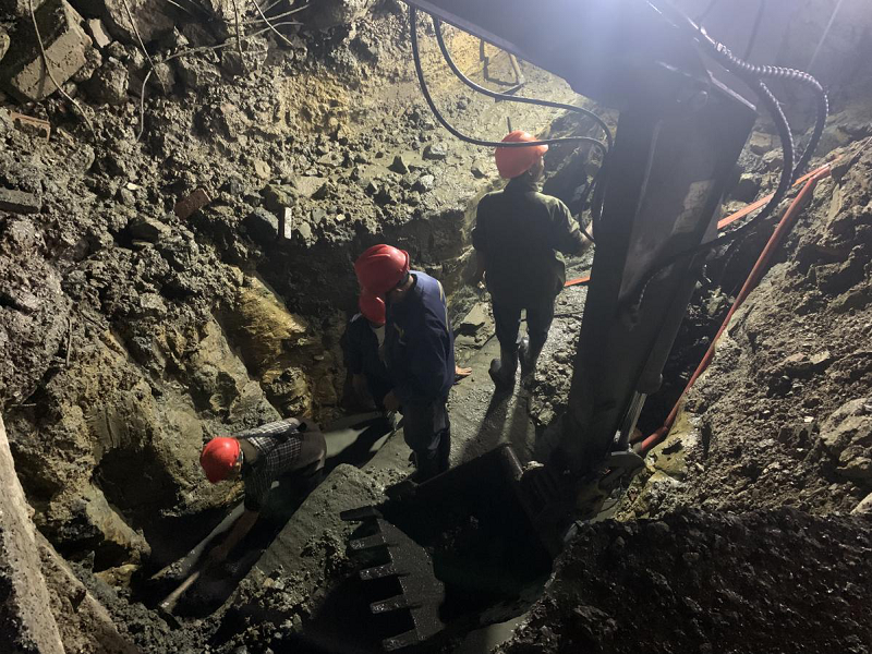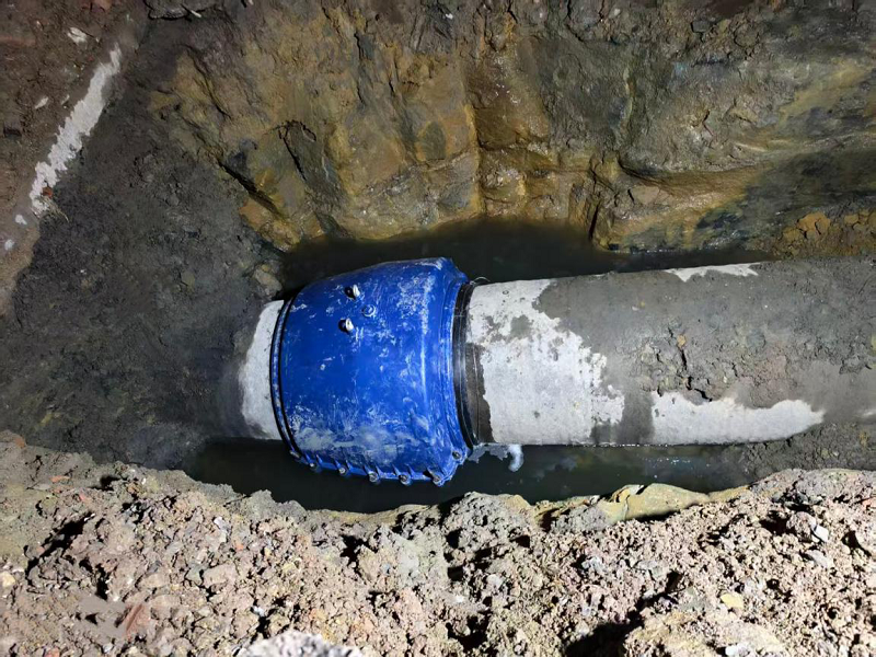 現(xiàn)場立即安排人員前往庫房調(diào)取專用搶修物資——8月定制的DN800球墨鑄鐵搶修節(jié)。又因取水主管底部及周邊被完整巖石包裹,機械開挖無法繼續(xù),作業(yè)方式緊急轉為人工開挖,6名作業(yè)人員在狹窄空間內(nèi)佝僂身體,持續(xù)挖掘直至晚上10時30分,終于開辟出合格作業(yè)面。隨后,施工人員用機械將搶修節(jié)運送至作業(yè)點,反復調(diào)整角度確保與管道精準匹配,最終在10月22日凌晨2時21分完成全部搶修作業(yè)。